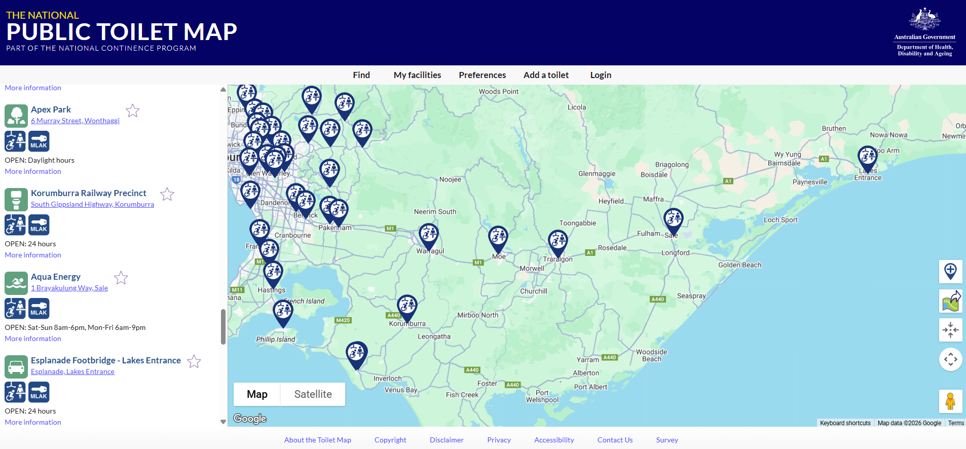 Use the National Public Toilet Map – Visit https://toiletmap.gov.au to find MLAK toilets and Changing Places facilities. You can filter by accessibility features, transfer side, and hoist availability to suit your individual needs.Below is a screenshot from the National Public Toilet Map showing examples of Changing Places facilities in Gippsland and East Melbourne that can be accessed using an MLAK key.